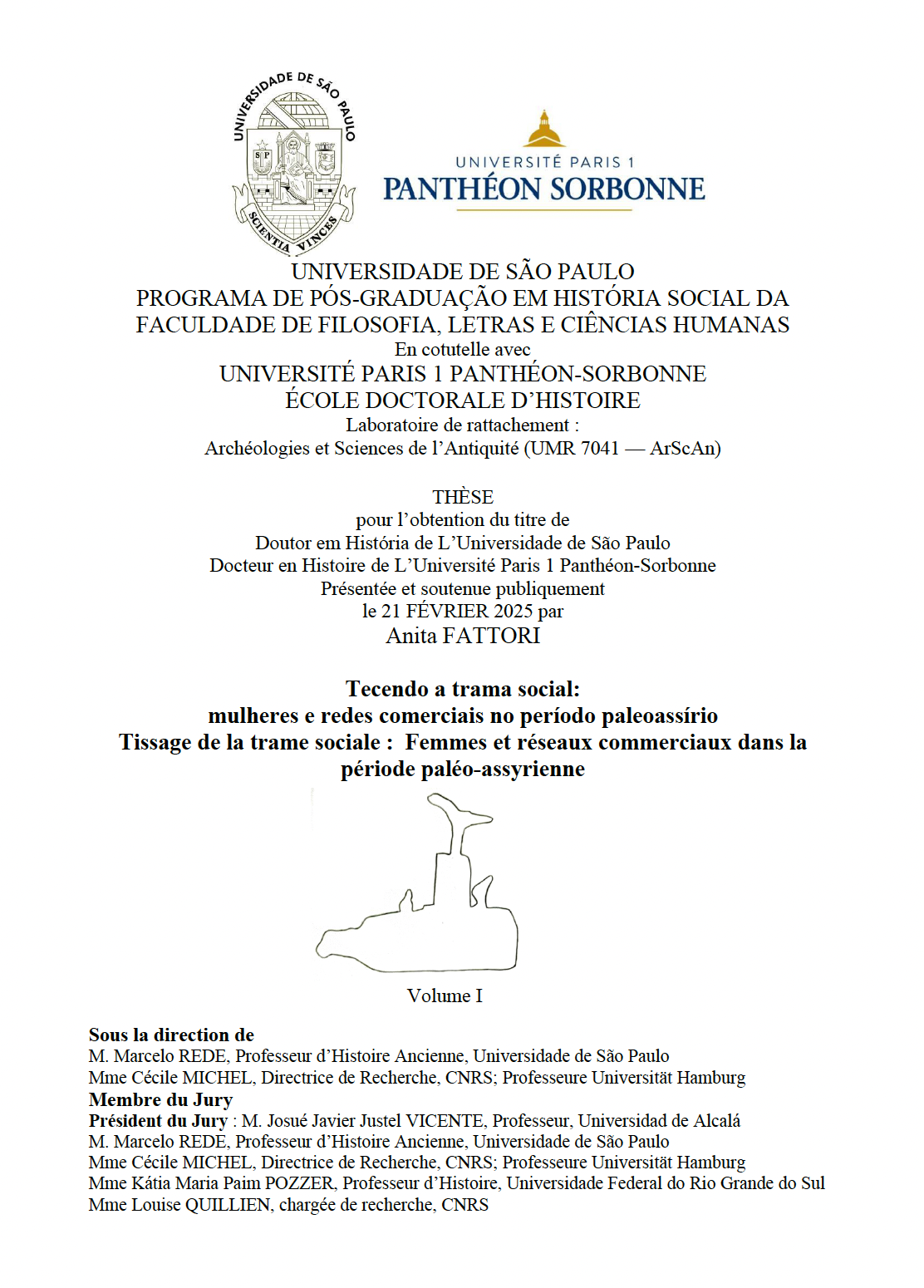 La thèse a été préparée sous la direction de Cécile Michel à l’Université Paris 1 Panthéon-Sorbonne en cotutelle avec l’Université de Sao Paulo sous la direction de Marcelo Rede. La soutenance a eu lieu le 21 février 2025.