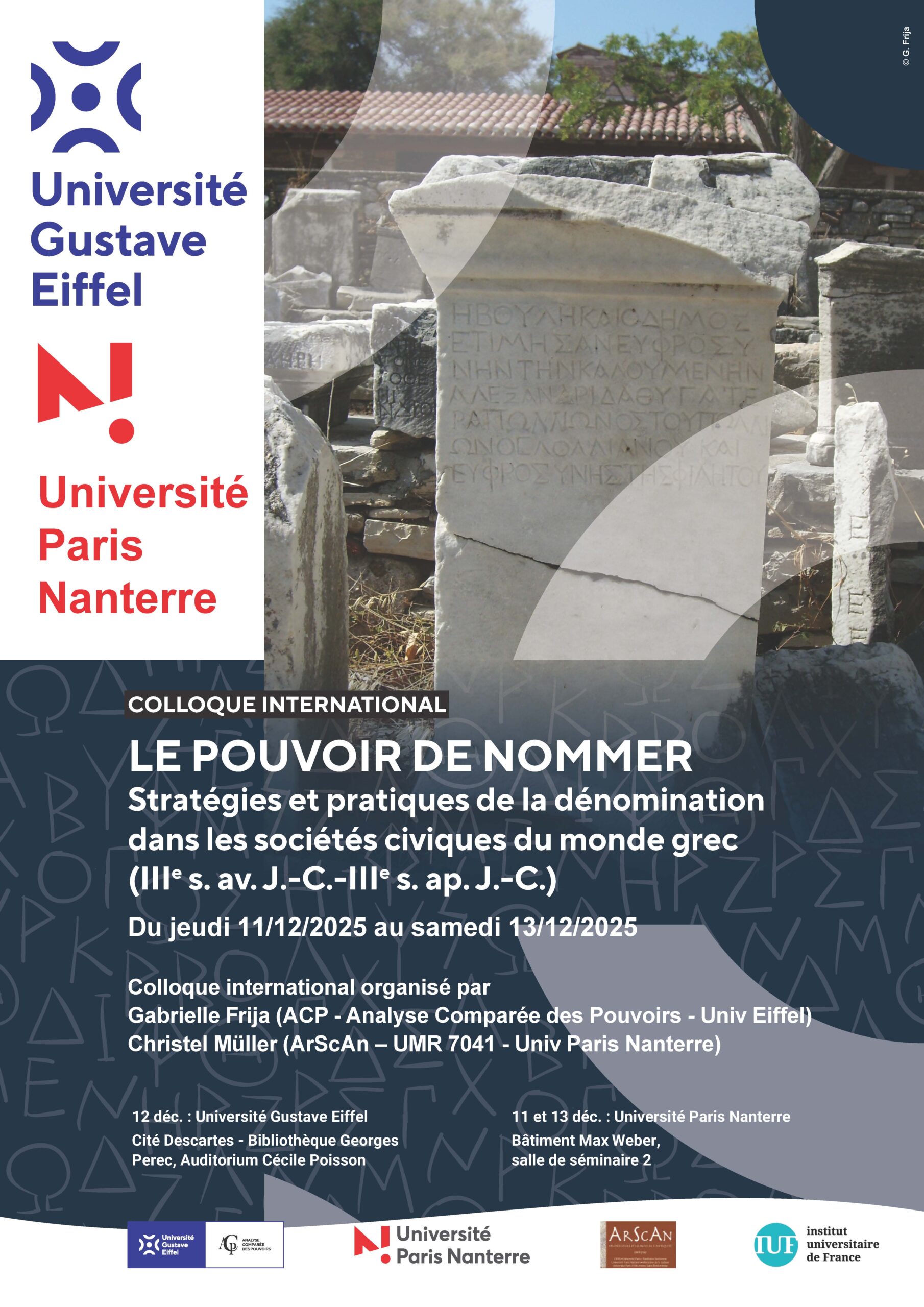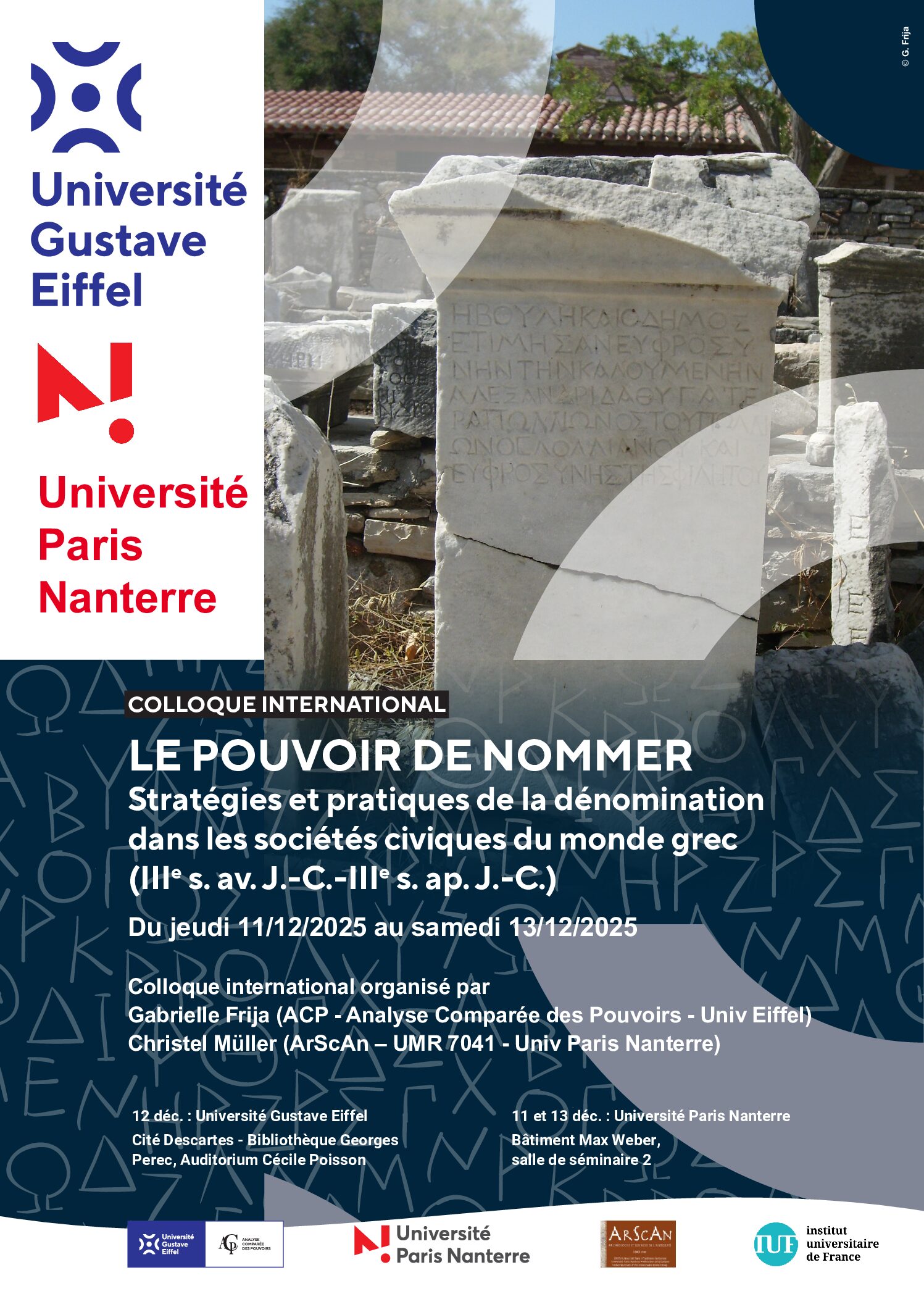 Gabrielle Frija (ACP – Analyse Comparée des Pouvoirs – Univ Eiffel) et Christel Müller (ArScAn – UMR 7041 – Univ Paris Nanterre) organisent prochainement le colloque international “Le pouvoir de nommer : Stratégies et pratiques de la dénomination dans les sociétés civiques du monde grec (IIIe s. av. J.-C.-IIIe s. ap. J.-C.)”.