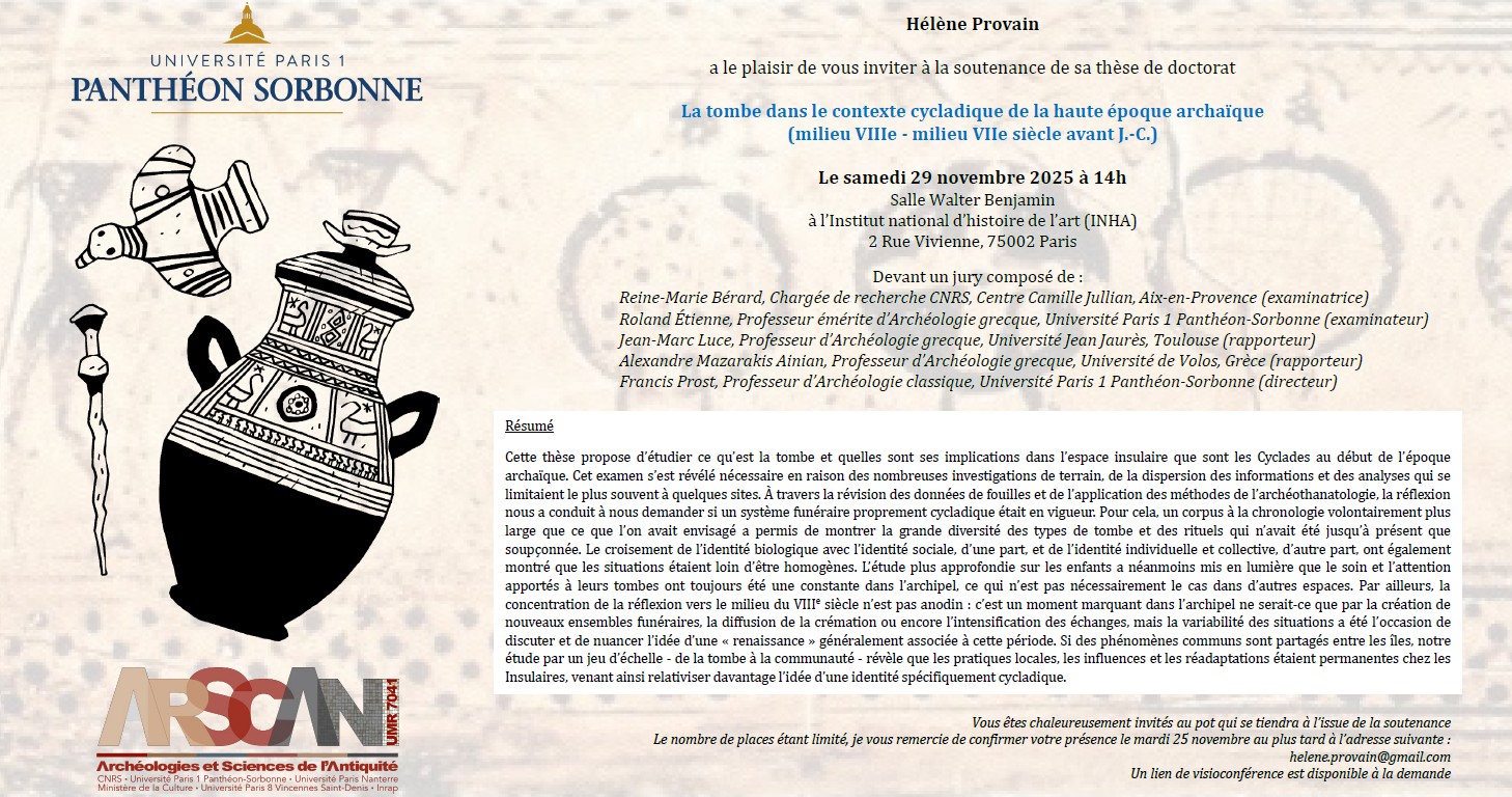 Nous avons le plaisir de vous annoncer la soutenance de thèse d’Hélène Provain, doctorante au sein de l’équipe Archéologie des mondes grecs, intitulée “La tombe dans le contexte cycladique de la haute époque archaïque (milieu VIIIe – milieu VIIe siècle avant J.-C.)“