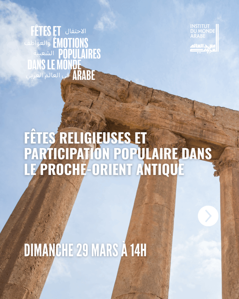 Une table ronde sur le thème “Fêtes religieuses et participation populaire dans le Proche-Orient antique” aura lieu le dimanche 29 mars à 14h à l’Institut du Monde Arabe de Paris.