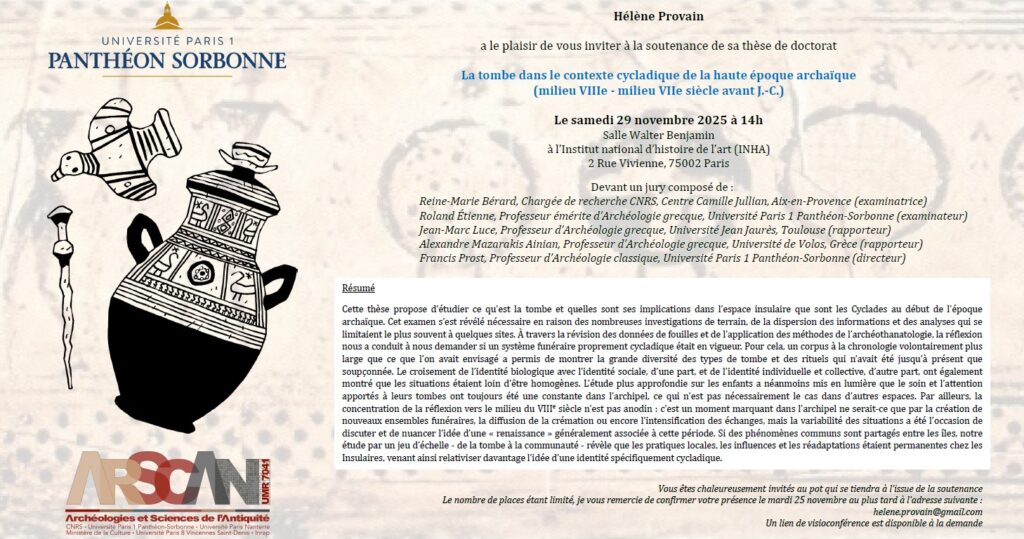 Nous avons le plaisir de vous annoncer la soutenance de thèse d’Hélène Provain, doctorante au sein de l’équipe Archéologie des mondes grecs, intitulée “La tombe dans le contexte cycladique de la haute époque archaïque (milieu VIIIe – milieu VIIe siècle avant J.-C.)“ La soutenance se déroulera le samedi 29 novembre 2025 à 14h00 Salle Walter…