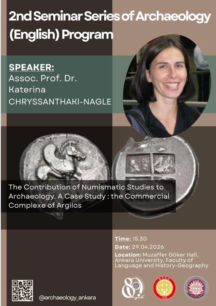 La numismate Katerina Chryssanthaki-Nagle (Université Paris-Nanterre-ArScAn) a été invitée à l’Université d’Ankara pour ses recherches sur les monnaies d’Argilos et aussi sur l’Obole de Charon. Sa communication “The contribution of Numismatics Studies to Archaeology. A Case Study : the Commercial Complexe of Argilos” aura lieu le 29 avril 2026, à 15h30, à l’Université d’Ankara, au département de langues et d’histoire-géographie.